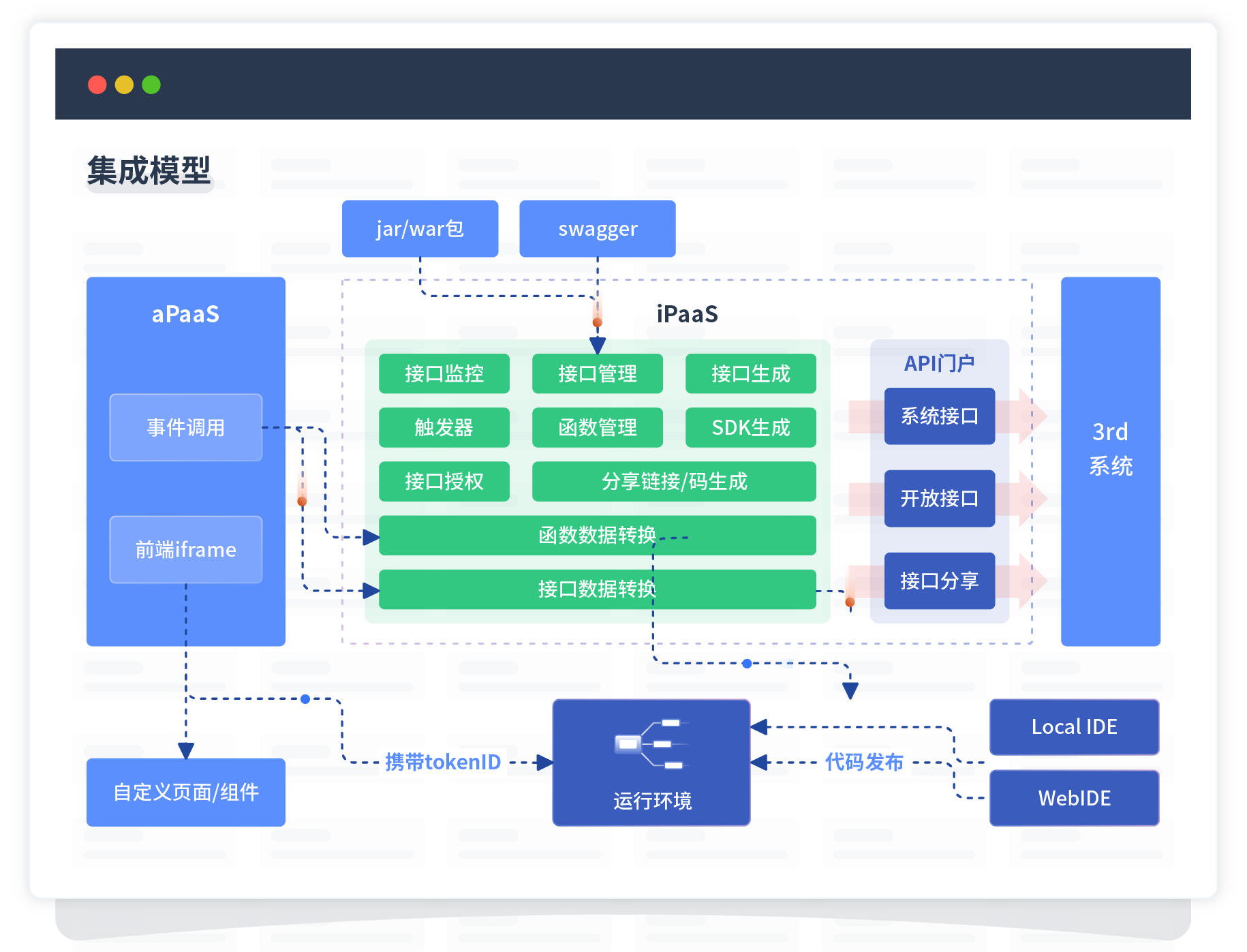 集成模型包括平台本身前、、、、、、、、、、、、、、后端能力的扩展,,,,,,,,,,,,,,也支持通过API门户和第三方系统进行交互。。。。。。。。。。。
