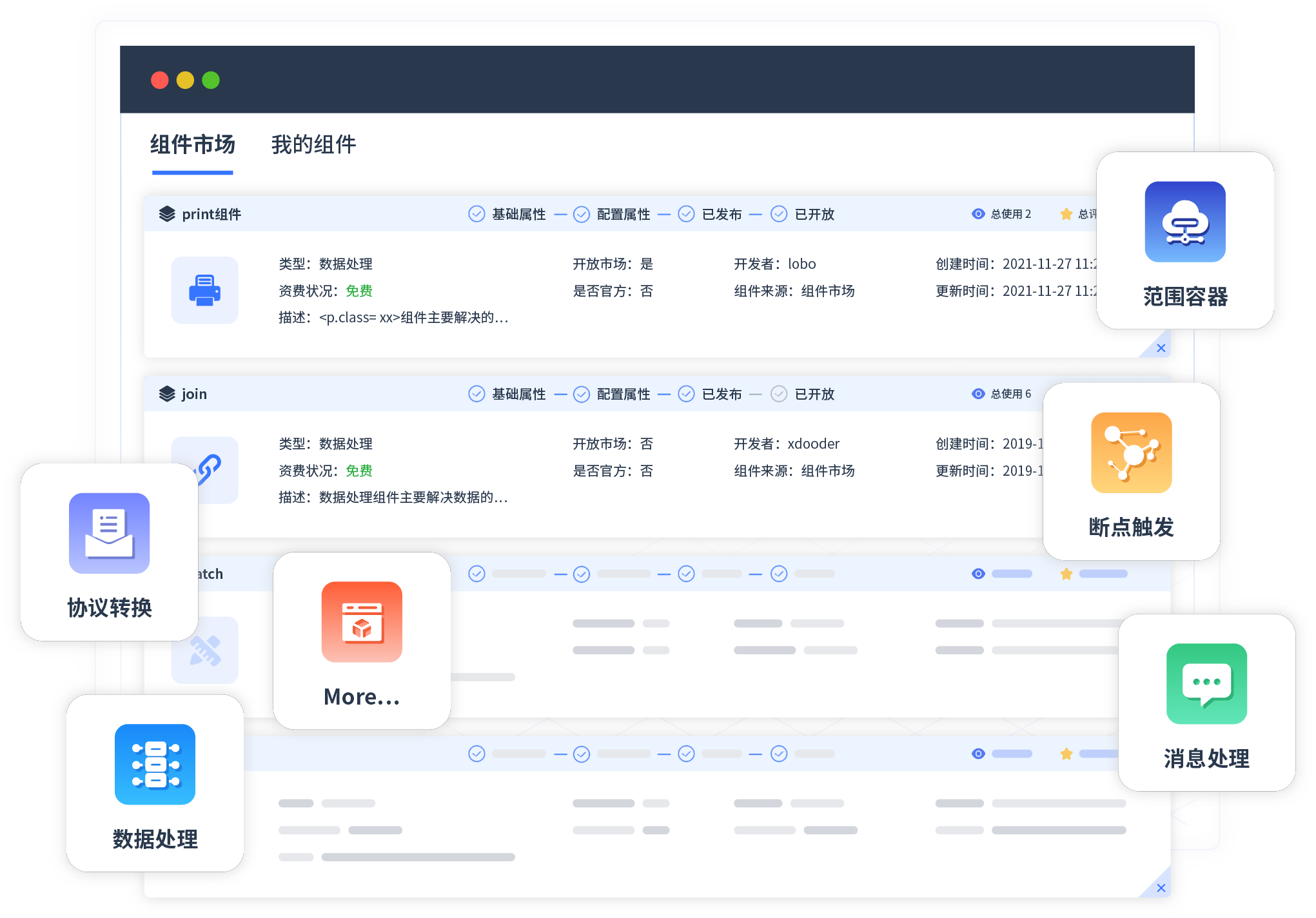 针对集成场景,,,,,,,EBPAY提供组件市场,,,,,,,,,,,例如协议转换、、、、、、、、、、、、、、、消息处理、、、、、、、、、、、文件操作等。。。。。。。。。。。。除平台提供的组件外,,,,,,,客户可以自定义所需组件。。。。。。。。。。