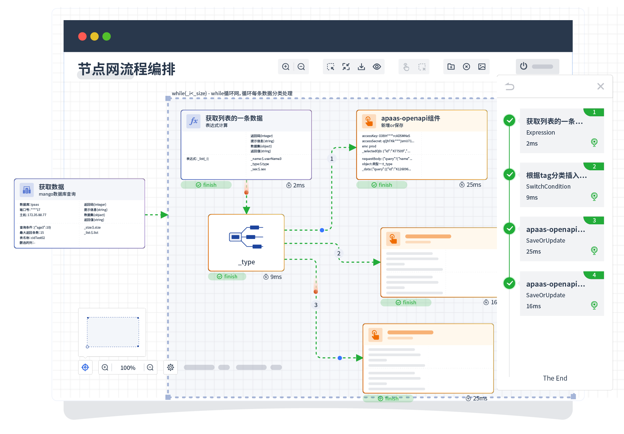 针对集成场景,,,,,,,,,,,组件定义后支持进行流程编制,,,,,,,不同于传统代码方式,,,,,,,,通过图形化展示,,,,,,,,,支持在线调试、、、、、、、、、、日志查看和运行回放。。。。。。。。