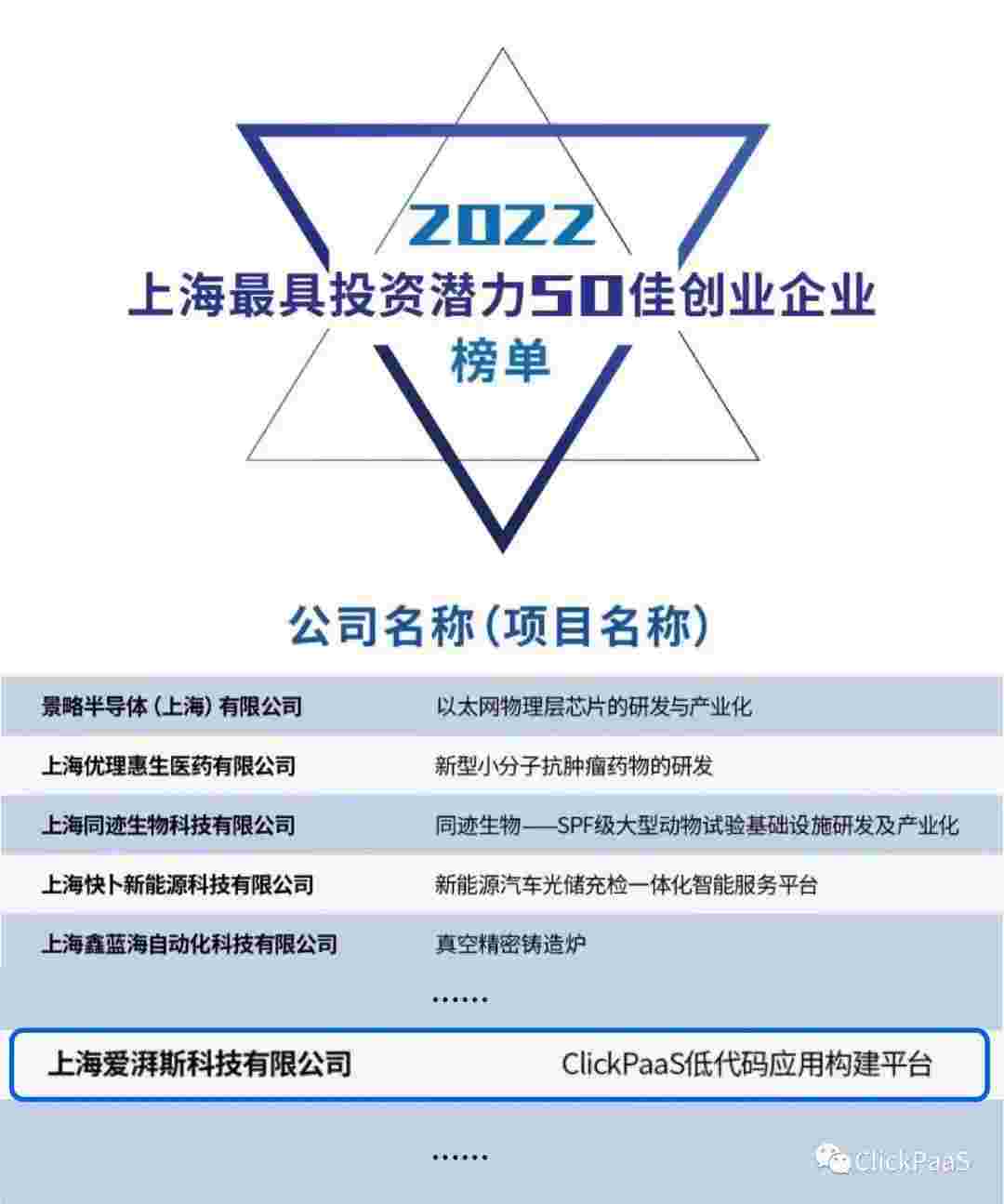 EBPAY 作为国内低代码PaaS平台的领军企业,,,,,,,,,,,,与120家创企入围角逐。。。。。期间接受了来自德同资本、、、、、、、、、、领中资本等知名投资机构的10位投资人组成专家评委团的背靠背盲选。。。。。。。并最终入围“2022上海最具投资潜力50佳创业企业”榜单,,,,,,被列入“上海市重点培育创业企业库”。。。。。
