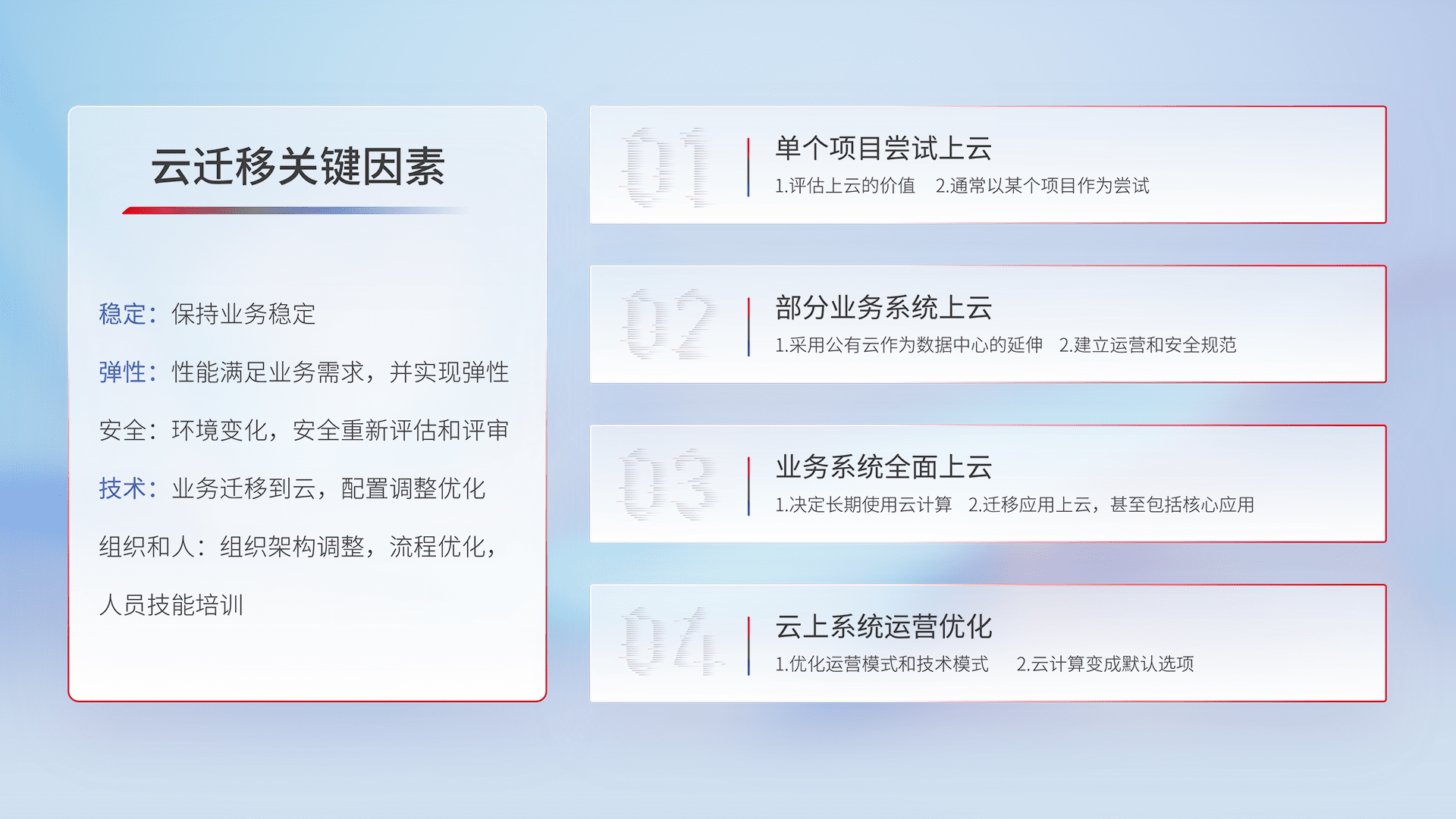 结合实际业务,,,从规划设计、、、云平台选型、、、云原生改造、、、、数据迁移、、、集成交付,,,迁移全过程为客户识别最佳上云路径,,做好风险识别管理,,设计网络架构、、、身份权限、、、安全审计合规、、操作审计、、、日志审计、、、监控告警策略、、多站点容灾设计等,,,,对云上基础设施进行整体规划,,,,提升IT治理水平,,以满足弹性、、、、高可用、、、、高性能的需求。。。。
