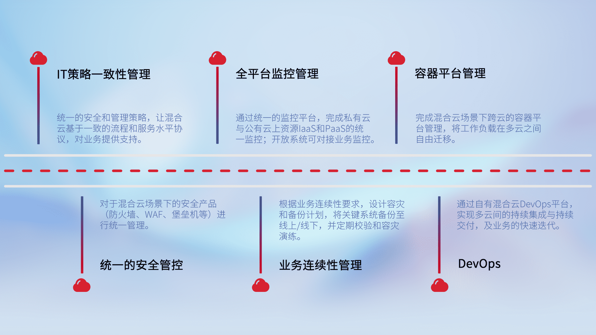 通过多云纳管,,,,以统一的资源数据模型把客户的云资源进行抽象和封装,,,,进而实现对多云资源的统一操作,,保障云资源管理的可靠性、、、稳定性与可用性。。量身定制化运维内容,,,,配置、、、开发运维、、、、补丁管理、、、备份、、、监控、、认证和访问管理、、、、审计和日常巡检等,,,,保障在用云过程中的可靠度,,,,稳定度以及高可用率。。