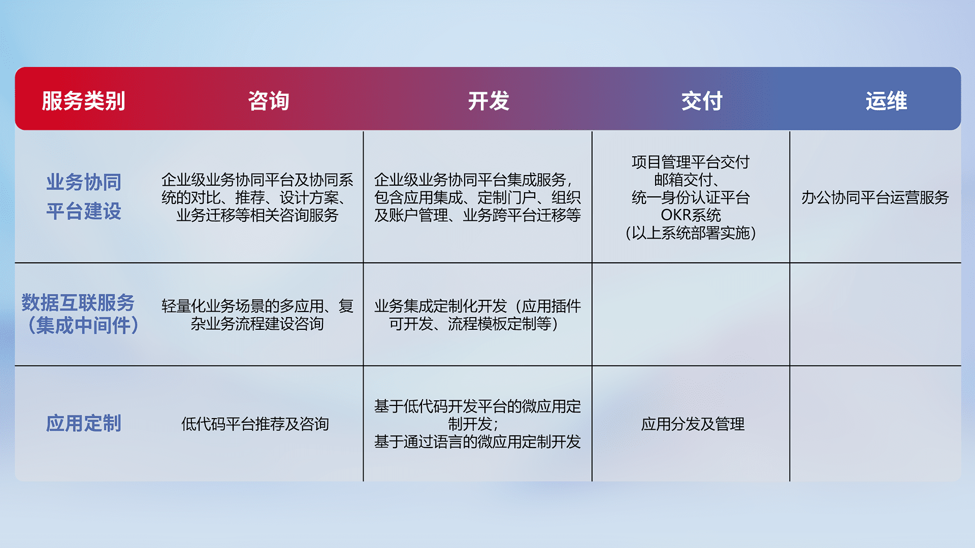 针对钉钉、、企微、、IDaas等平台级产品提供产品的规划、、、、方案、、、交付、、、定制化开发等服务,,,实现如统一协同办公、、、、智能客户服务、、、、混合会议管理、、智能数据查询、、、、等业务场景,,,实现数字化转型。。。。